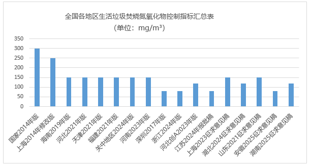 回溯至 2014 年正式實(shí)施的《生活垃圾焚燒污染控制標(biāo)準(zhǔn)》(GB 18485-2014),其中氮氧化物 300mg/m3 的限值,成為當(dāng)時(shí)全國生活垃圾焚燒行業(yè)統(tǒng)一的排放 “天花板”。而此后十年間,地方標(biāo)準(zhǔn)通過三輪持續(xù) “自我加壓”,不斷刷新氮氧化物排放限值。